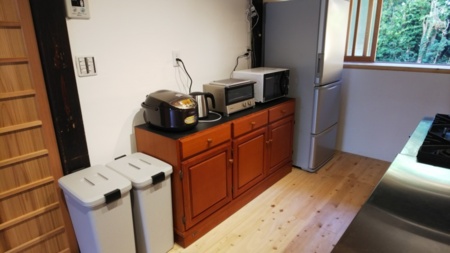 ・キッチン(ガスコンロ2口)、冷凍冷蔵庫(350L)、電子レンジ、炊飯器(一升炊き)、トースター、電気ケトル