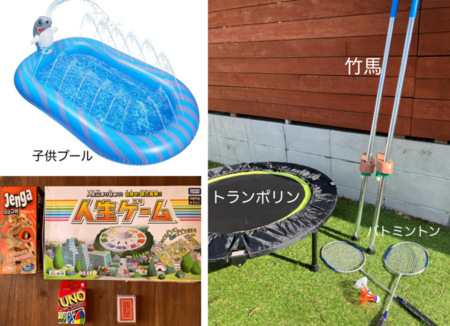バス・シャワー、ウォシュレットトイレ、テレビ、調理器具一式、食器一式、冷蔵庫、電子レンジ、ガスコンロ、電気炊飯器、電気ケトル、IHコンロ、ドライヤー、洗濯機、バーベキュー用品、自転車、ビニールプール