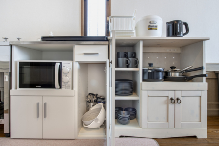 - 電気ポット、フライパン、グラス、皿