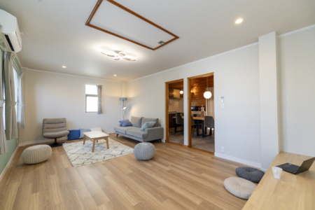 ダブルベッドを大人2名でお使いいただくことにご不便がある場合、リビング等に敷いてお使いいただける追加のお布団をご用意することができます。(2,500円/1セット)