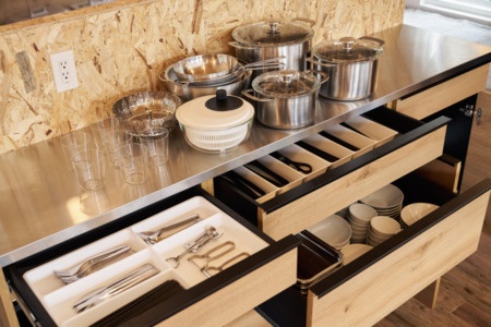 大きなダイニングテーブルには雨天でもBBQ可能な鉄板(HIコンロ)や水回りも埋め込まれ、家族や仲間揃ってのクッキングから食事まで楽しめます。