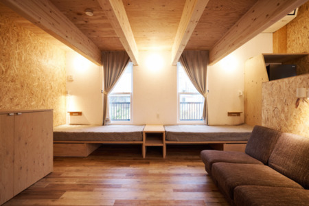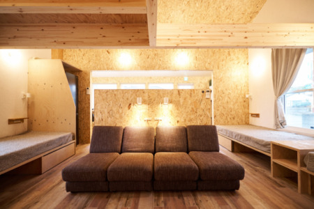 1階リビングスペース;シングルベッド4台、ソファベッド2台
