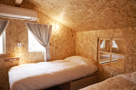 屋根裏を模した2階寝室からは、吹き抜けで宿全体が覗けます。こどもの頃に描いたかわいらしい隠れ家を想像させる寝室です。