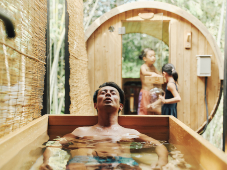 浴室からつづくテラスには、プライベートサウナまで!貸切&使い放題で、思う存分整ってください♪