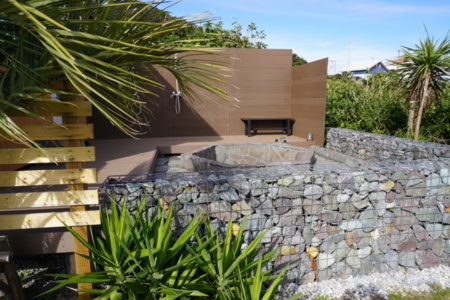 貸切は宿泊建物とデッキで庭、コンテナ、露天風呂は貸切ではありません