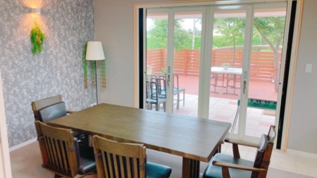 1階は広いウッドデッキと繋がっていてBBQができます。