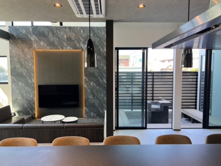 大きな100インチTVを囲んでコの字型にソファーを配置。リラックスしての会話が弾みます。