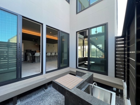 特別仕様で作製したBBQ台を囲んで、ぐるりと縁側を配しました。夏の夕涼みには、やわらかな火を囲んで非日常をお楽しみ頂けます。
