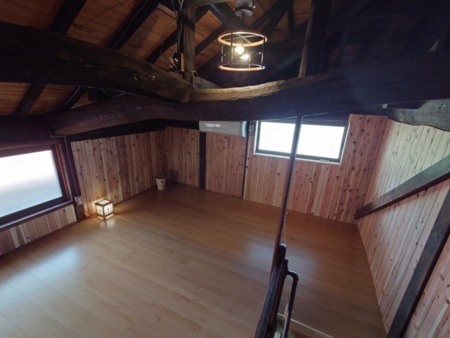 建物は大正3年築110年の古民家。日本古来『木組み』工法による『入母屋造り』。柱梁などの所要部分に釘などの金物を使わずに、基本的に木材で建物を組み上げる非常に精密な日本古来の技術です。木材の端部を複雑な形状に刻み加工し、お互いをはめ合わせることでがっちりと固定させます。元々囲炉裏のあった場所にテーブル囲炉裏を設置。風呂は国産檜の香る畳3畳ほどの空間から山が望める半露天風。