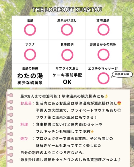 THE LOOKOUT KUSATSUについての施設概をまとめてみました。当施設は、群馬の草津・尻焼・花敷エリアに立地してます。所在地は「群馬県吾妻郡草津町草津464-962」となります。※ 地図情報がある場合は下記に表示します。