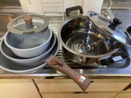 冷蔵庫 / 2口ガスコンロ /オーブンレンジ・炊飯器 ・電気ケトル ・トースター / 調理器具・包丁・まな板・調理ハサミ・オタマ・トング・鍋・フライパン・皿・コップ・ワイングラス・箸・スプーン・フォーク / 食器洗剤 / デイリーコンパクトプレート / 土鍋 / カセットコンロ(カセットボンベ1本付き)