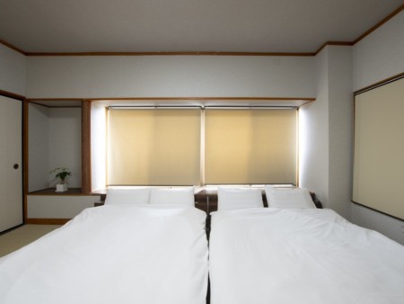 和洋室の広々47平米のお部屋です!ダブルベッド2台、ソファベッド1台、敷布団4組。キッチン、バス・トイレ付き