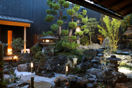 建物の奥には庭園の中に設えた岩露天風呂があり、石組みと灯籠、植栽に囲まれた景観の中で外気を感じながら湯浴みをお楽しみいただけます。