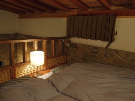●ロフトは、天井は低いですが草屋根と壁の断熱効果で温度差の少ない空間となっております。6㎡ちょっとの小さな空間ですが、シングルの和布団を2組敷けます。(丸ごと太陽に干せる和布団を使っています)