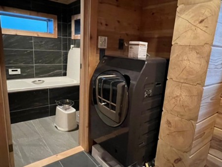 コテージの特徴は、お風呂の豪華なタイル張りの床、リビングには薪ストーブ、そして2階に輝く輸入シャンデリアです。