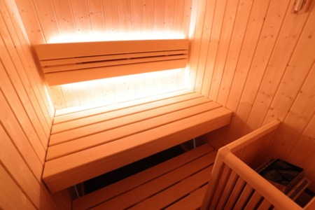地下にサウナ、シャワールーム、1階にキッチン、トイレ、リビングルームがあります。