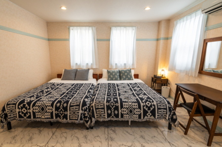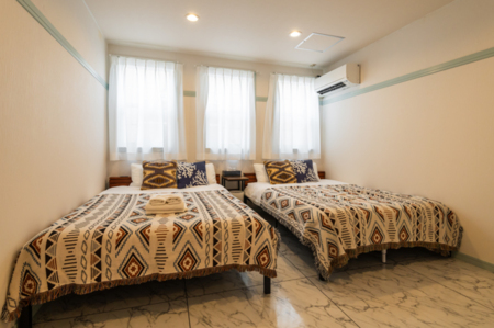 ・寝室①:ダブルベッド2台+布団1組+ベビーベッド1台(ベッドガード利用可)