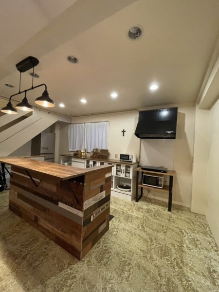 ヴィンテージな雰囲気のキッチンカウンターにゆったりとしたソファがとてもおしゃれでお客様から高評価を頂いております♡