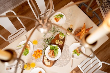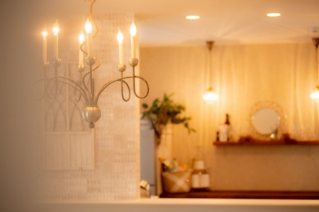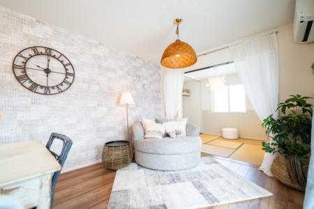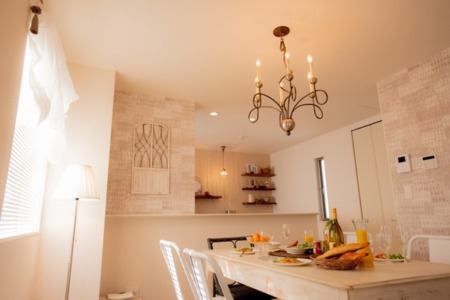 ・ソファ・ダイニングテーブル・テレビ・Wi-Fi・・エアコン・間接照明・シャンデリア・スポットライト