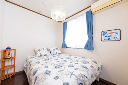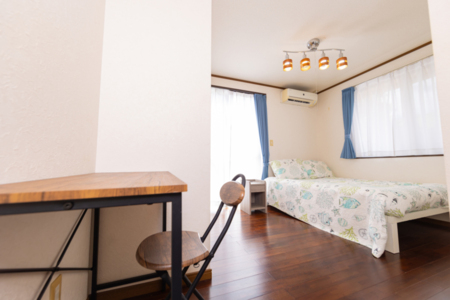 ー寝室2 ダブルベッド1台・折り畳みシングルベッド(布団使用)・ワーキングデスク
