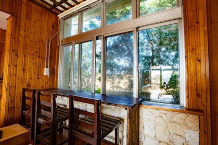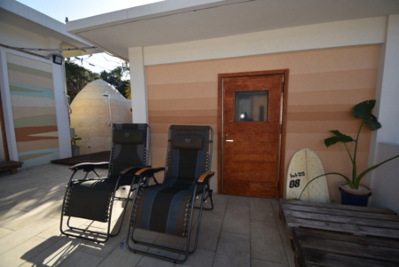 ダイニングテーブル、ソファ、ハンモックが設置してあり、お好きなようにリラックスしてお過ごしください。