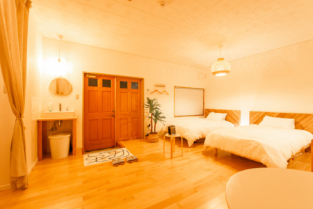 ・セミダブルベッド2台・ソファ(シングル布団1セット)・エアコン・ハンガー・コンセント・間接照明