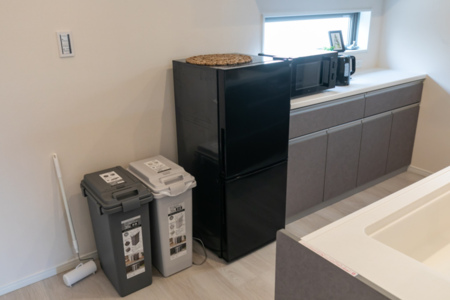 冷蔵庫、電子レンジ、調理器具や食器等も一通りそろってますので、お料理も楽しんで頂けます。
