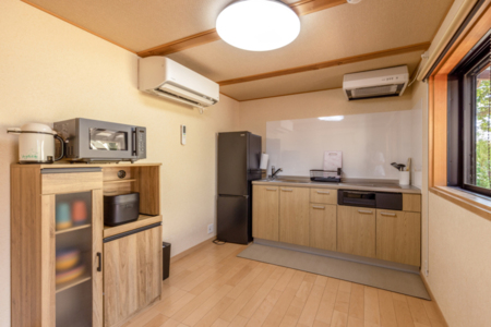 【備品・アメニティ】ドライヤー、シャンプー、コンディショナー、ボディーソープ、フェイスタオル、バスタオル、歯ブラシ、ブランケット、ポット、包丁、まな板、鍋、卓上IHクッキングヒーター、食器(皿、箸、スプーン、フォーク、コップ)