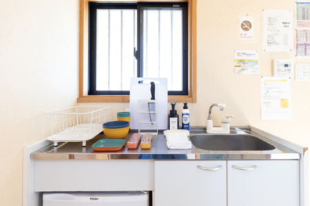 [キッチンルーム]調理器具(包丁、まな板、フライパン、なべ、ざる、ボウル等)、食器(コップ、皿、はし、スプーン、フォーク)、調味料(油、塩こしょう、醤油)