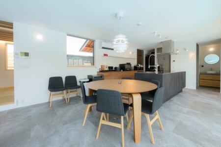 最大8名まで宿泊可能な広々としたリビングには、最新のプロジェクターを設置し、映画等を楽しめます。また、キッチンや調理器具に食器、調味料も充実しており、お料理のもてなしも存分に可能です。