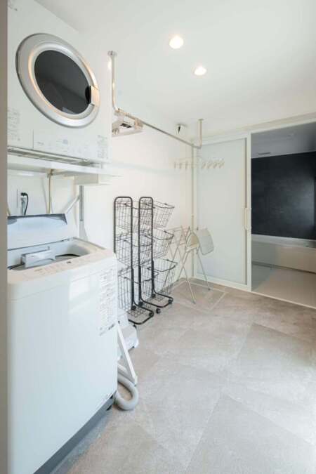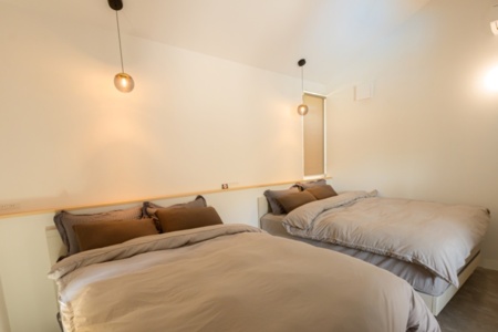 室内には、ダイニングキッチン・テーブル・和室(布団×4セット)・ベッドルーム(ダブルベッド×2台)トイレ、洗面台×2面・洗濯機・乾燥機・バスルームがあります。