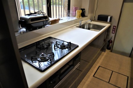 キッチン ガスレンジ 調理器具(フライパン、片手鍋2、両手鍋1)・調味料(醬油、ソース、塩、コショウ、ねりわさび) 食器一式 冷蔵庫(280L) 電子レンジ オーブントースター 電気炊飯器 コーヒーメーカー ウォーターサーバー(冷水、温水、常温水使用可) 魚ロースター 卓上IHコンロ(IH対応鍋) ホットプレート(雨天時のみ使用可) ドリンク(コーヒー、紅茶、日本茶)