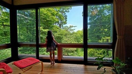 ★ダイニングキッチン・洋室・和室までをつなぐ解放感溢れる広縁があり、一面に並ぶガラス窓には四季折々の美しい森の景色が広がります。