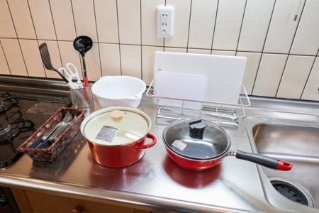 ‐調理器具(フライパン、鍋、まな板、包丁、フライ返し、おたま、ボウルなど)