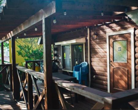 ログハウスならではの温かみのある木のぬくもりに癒されます。民族調のラグやポスター、星型ライト、陶器の小さなお城など、心安らぐインテリアも魅力です。