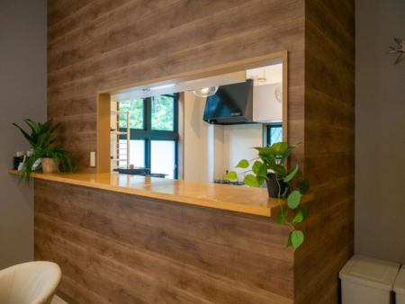 深い緑色のカーテンが印象的で、落ち着きと安らぎを感じる空間。自然の中にいるような穏やかさが魅力です。