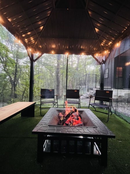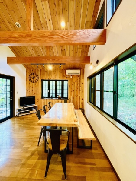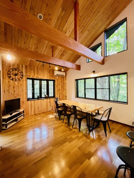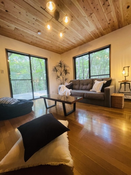 ウッドデッキは24平方メートル以上あり、くつろぐのに最適な場所です。また、自然を感じながら、スタイリッシュな内装でゆったりとお過ごしいただけます。