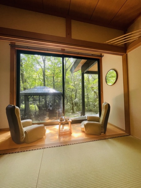 この豪華なロッジは、他の隣人から離れた森の中にあり、非常にプライバシーが保たれています。那須高原の静かな森の中にある700平方メートルの敷地に位置しています。