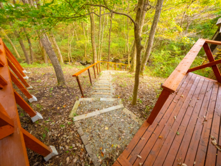 広いウッドデッキで心ゆくまで過ごす贅沢なひととき。焚火の温もり、川のせせらぎ、遥かに広がる空。