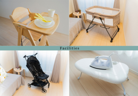 赤ちゃんや小さなお子さま連れのご家族にも安心してお過ごしいただけるよう、ベビーベッド、ベビーカー(無料貸し出し)、ベビー用ハイチェア、ベビー食器セットをご用意しています。