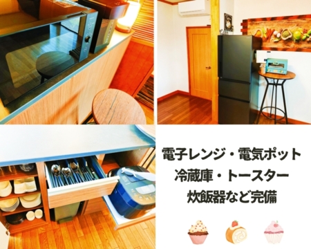 地元の食材を調理できるフルキッチンを完備。基本の調理器具や食器もご用意しております。
