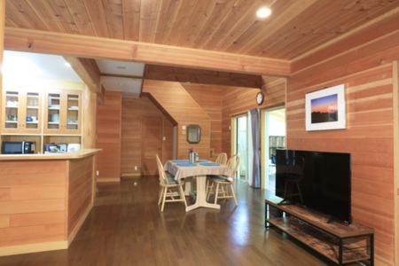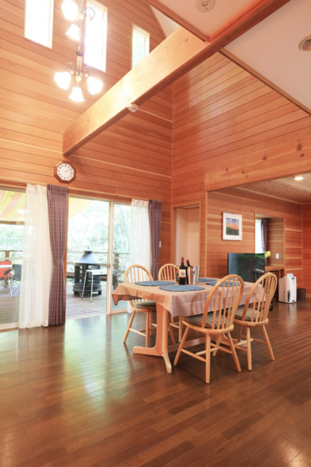 大きな梁が特徴的なリビングダイニング。寝室は洋室2間をご用意しております。8帖の洋間は4名様、4帖の洋間で2名様お休みになれます。