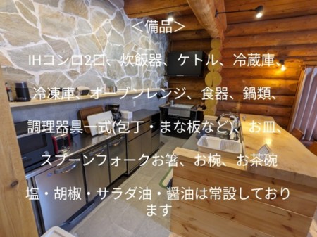 IHコンロ2口、炊飯器、ケトル、冷蔵庫、冷凍庫、オーブンレンジ、食器、鍋類、調理器具一式(包丁・まな板など)、お皿、スプーンフォークお箸、お椀、お茶碗、塩・胡椒・サラダ油・醤油は常設しております。