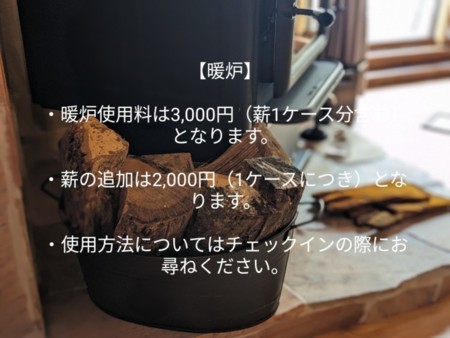 ・暖炉使用料は3,000円(薪1ケース分含む)となります。